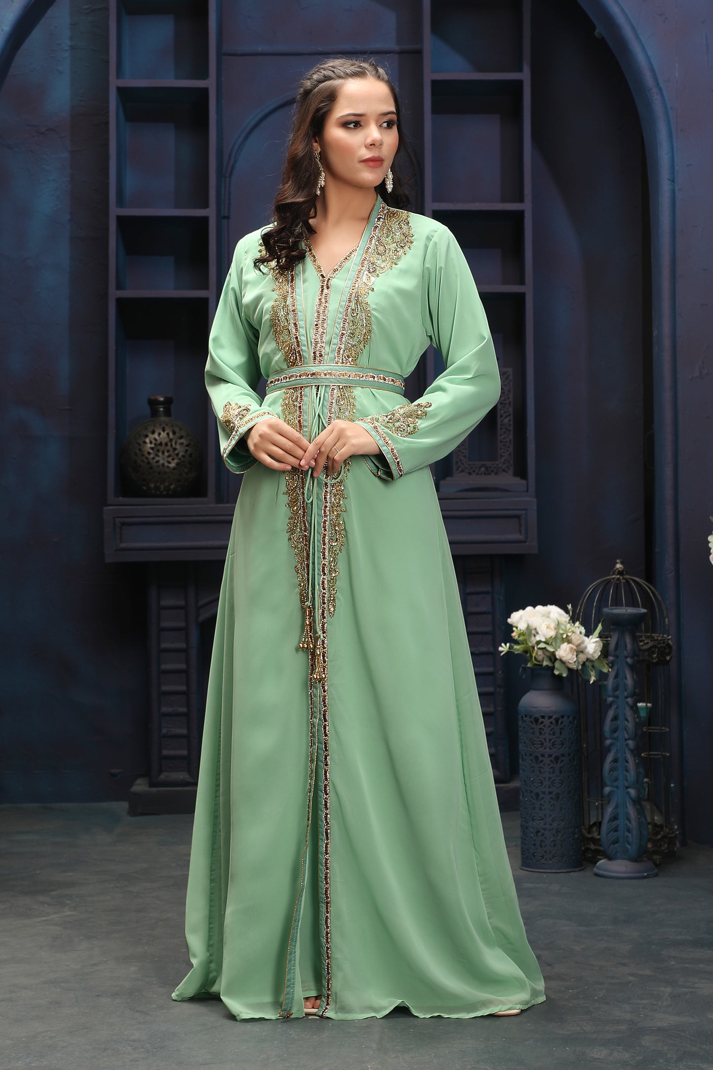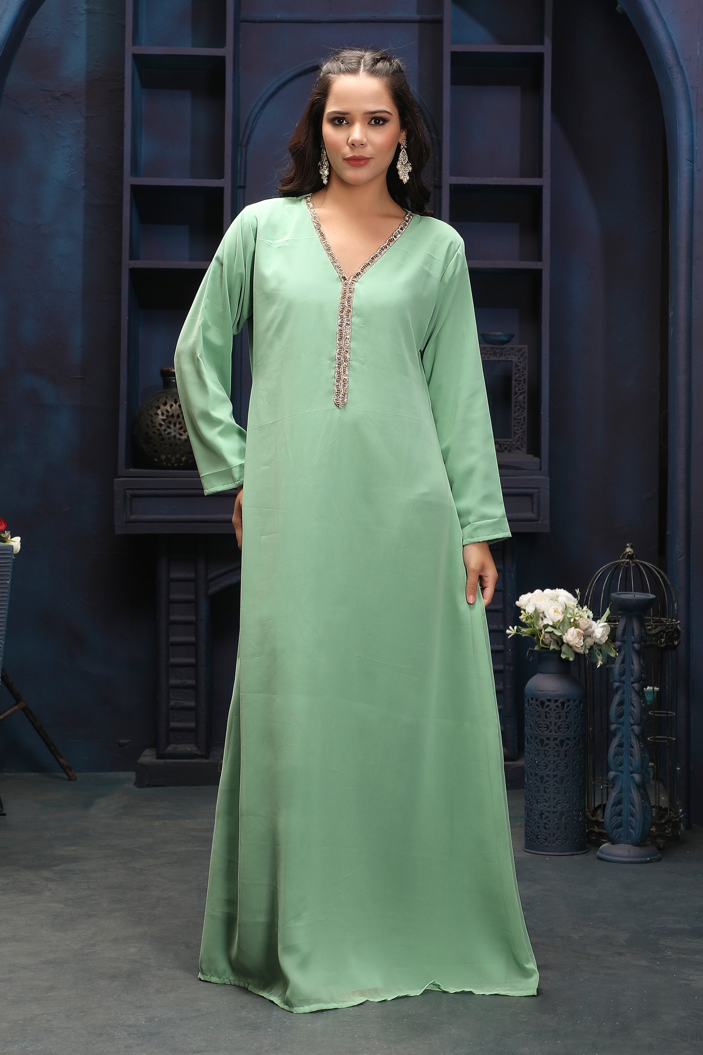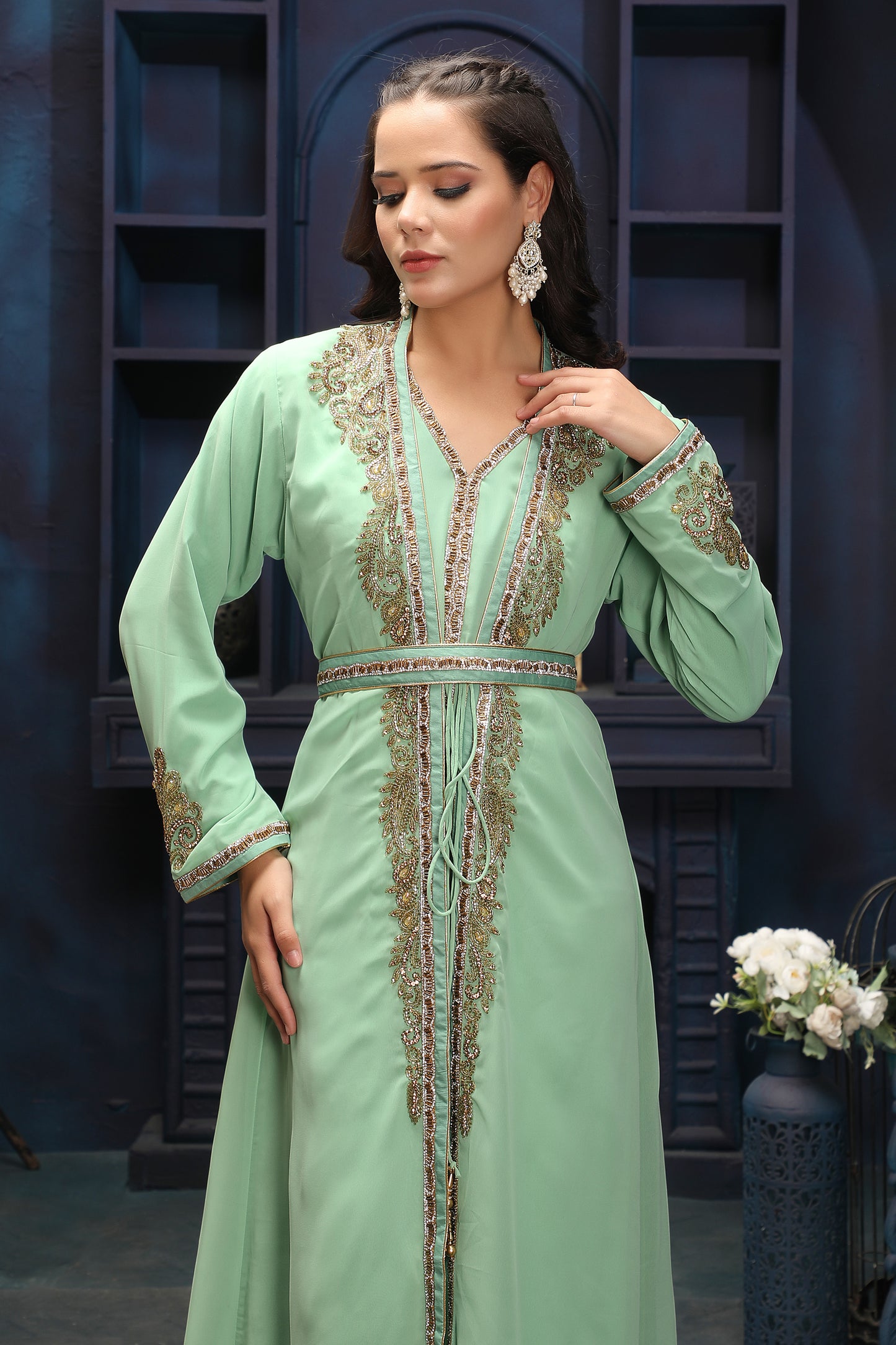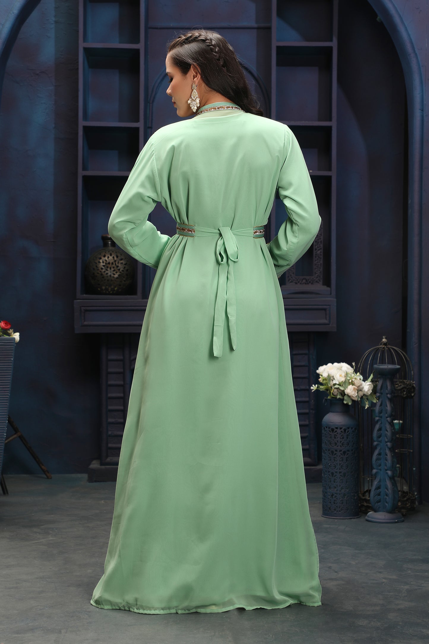 Mint Green Floor-Length Kaftan Gown with Elegant Handwork |