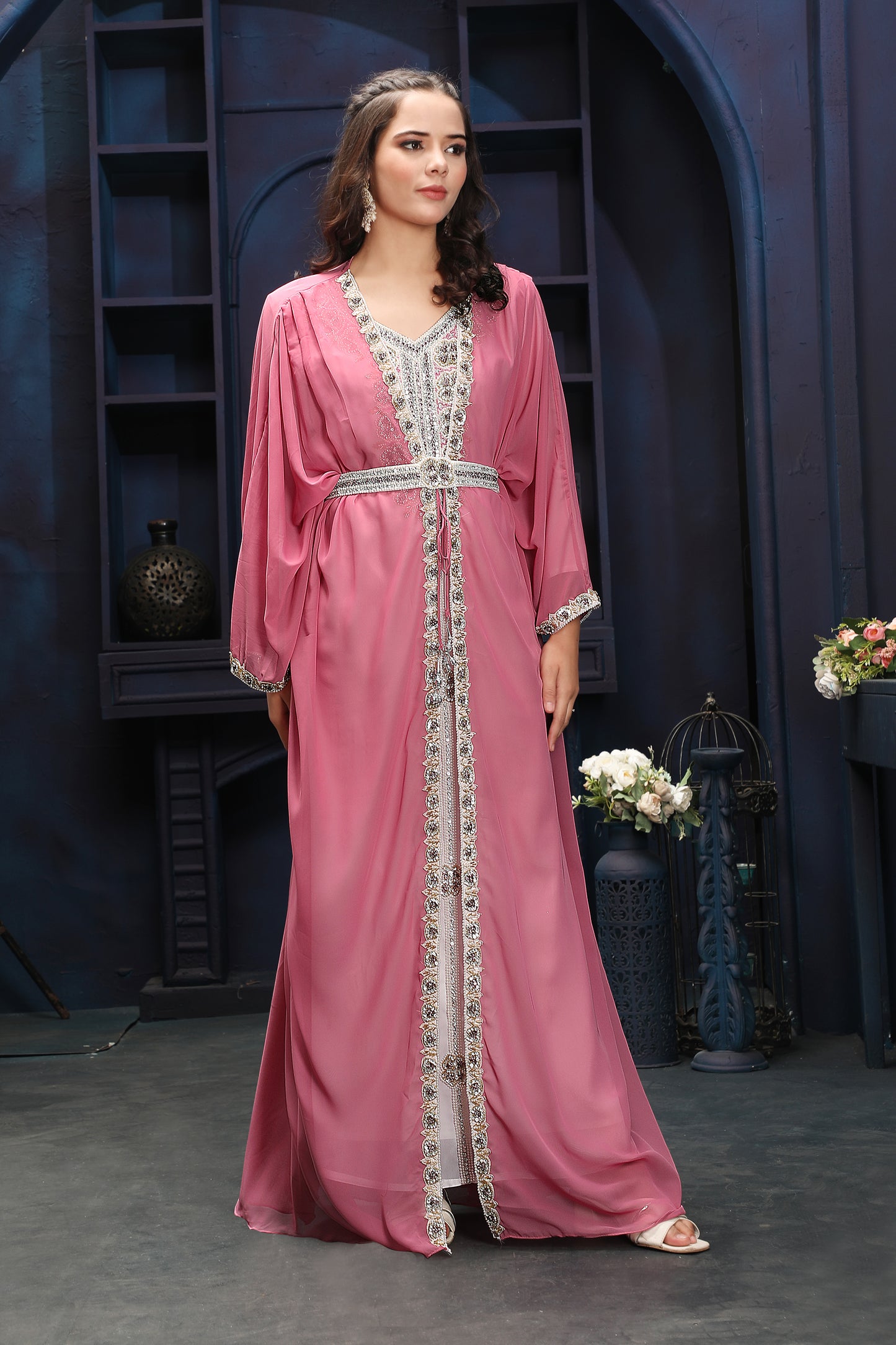 Premium Pink Floor-Length Kaftan with Statement Embroidery |