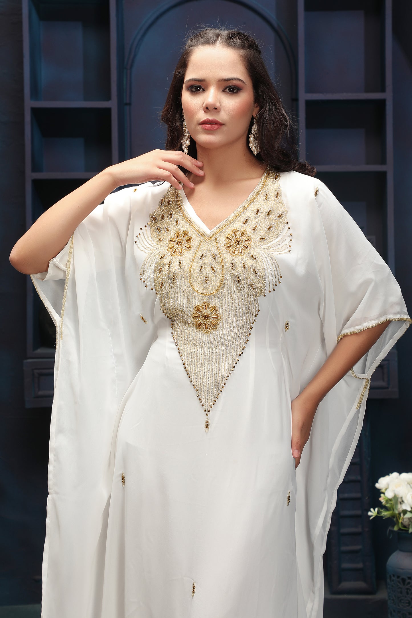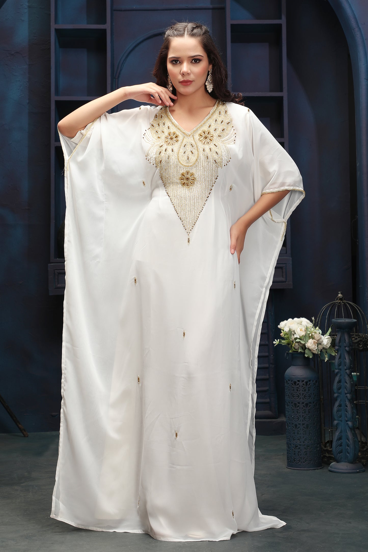 Luxury White Kaftan Dress with Rich Gold Embroidered Neck Design |