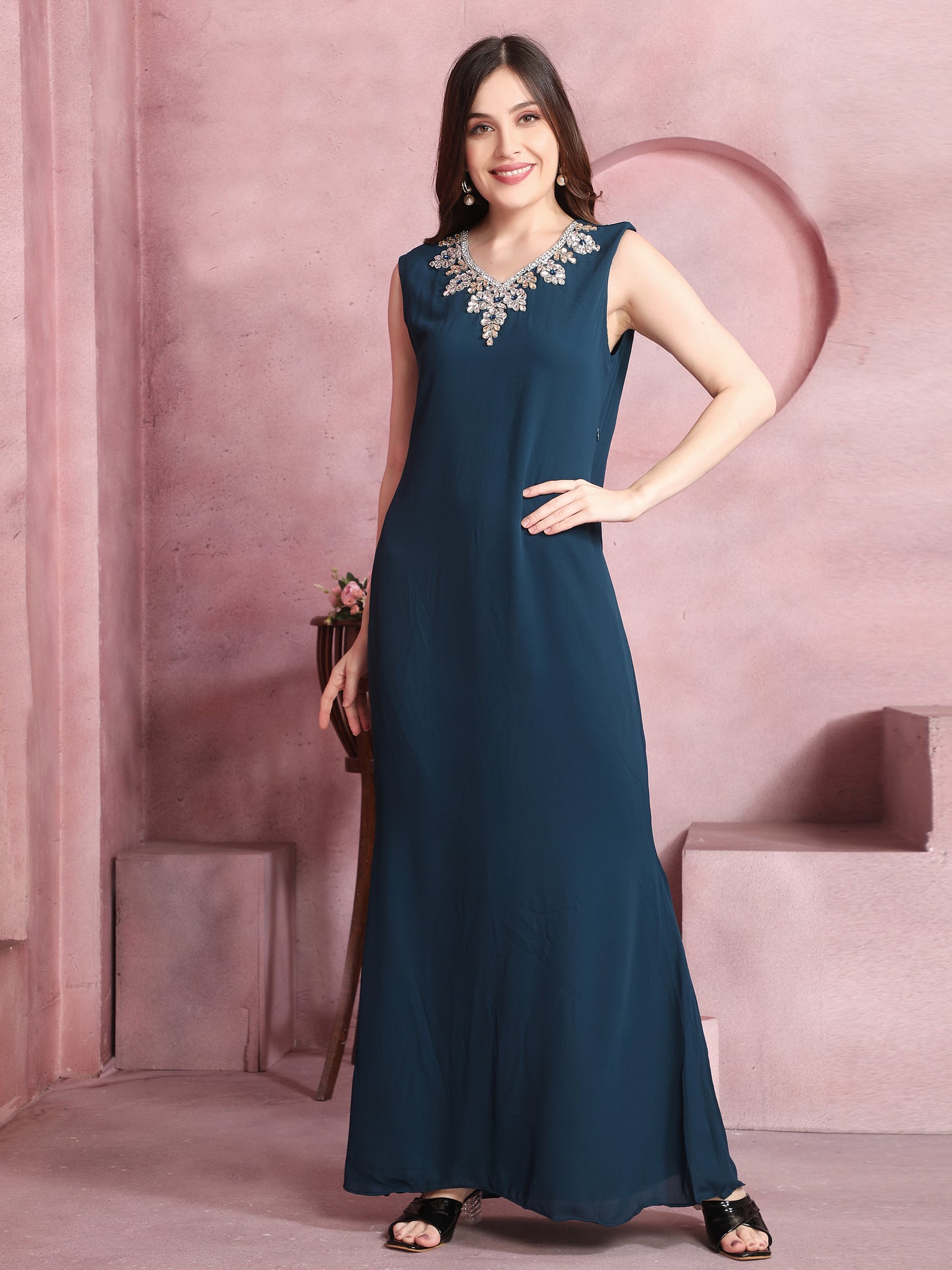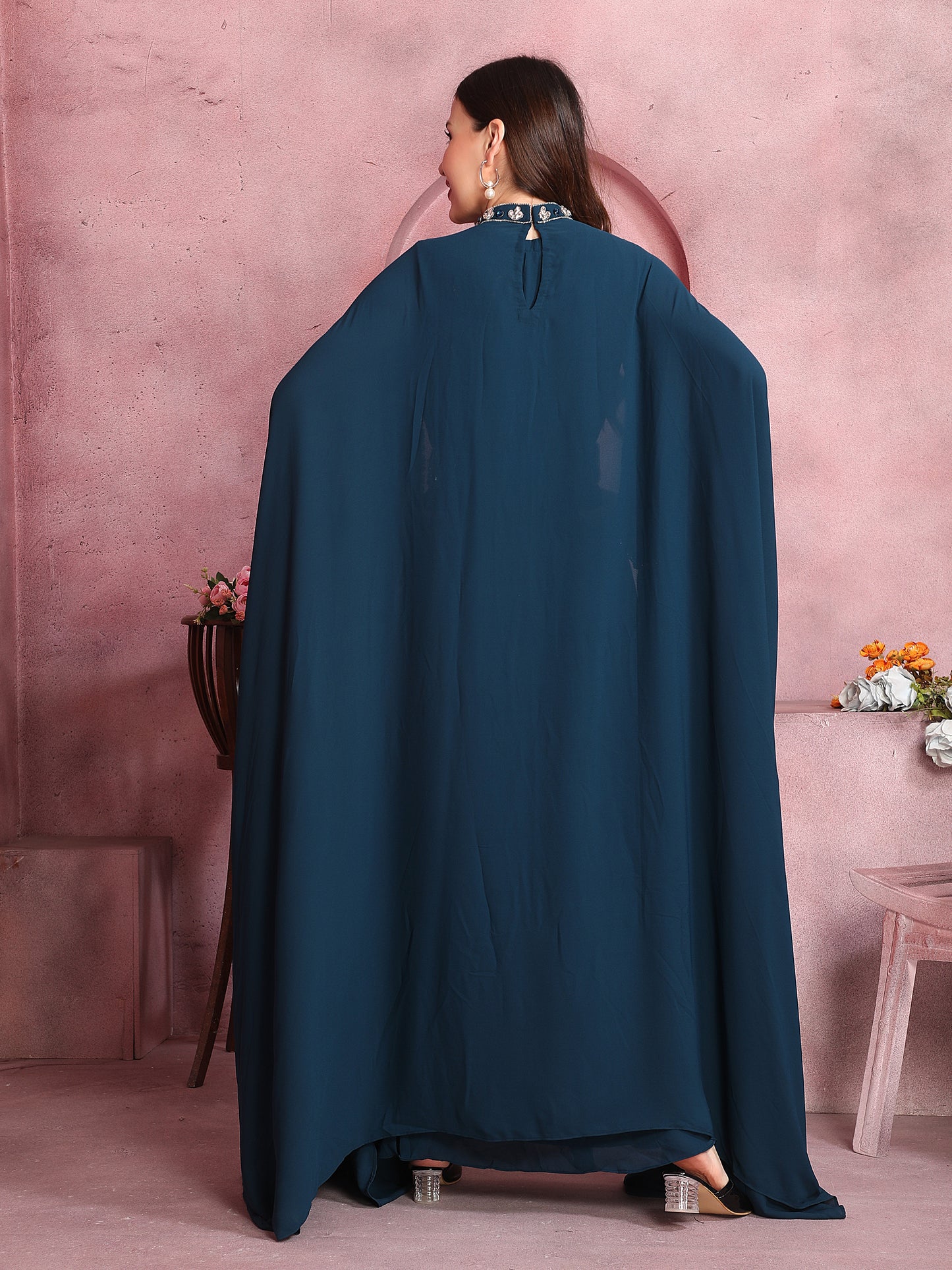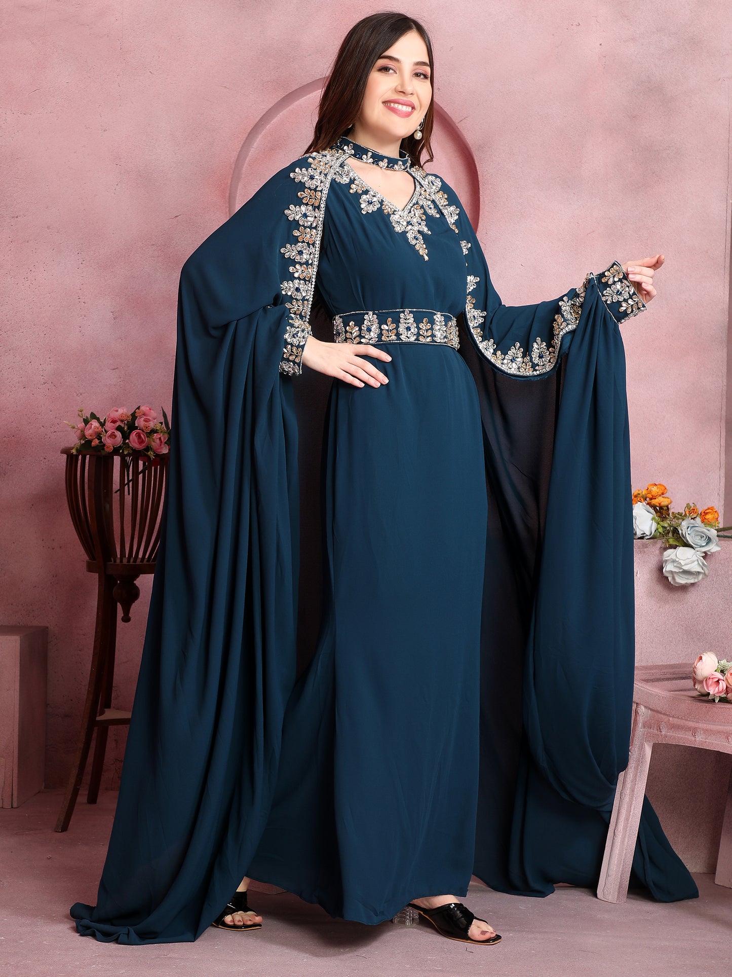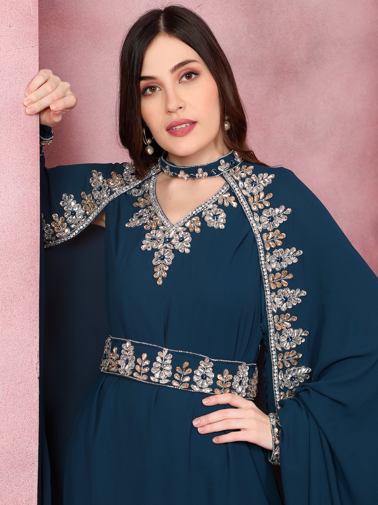 Crystal Studded Embellished Modestwear Caped Kaftan in Teal Blue