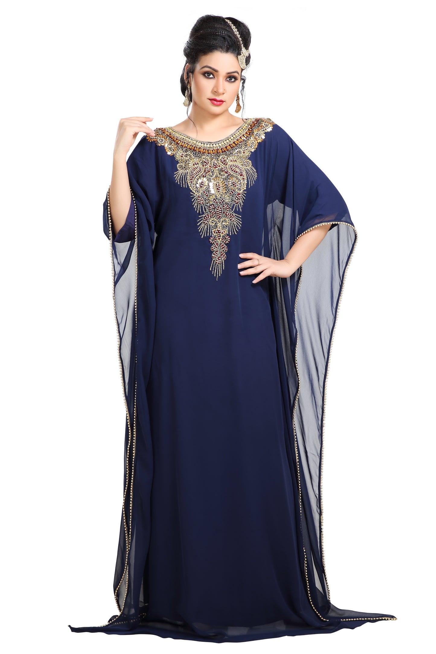 This mix colour beads and sequins hand embroidery will glitter up your occasion. This georgette fabric kaftan dress is 1 piece set & half sleeve dress (This dress is lined from the inside). |