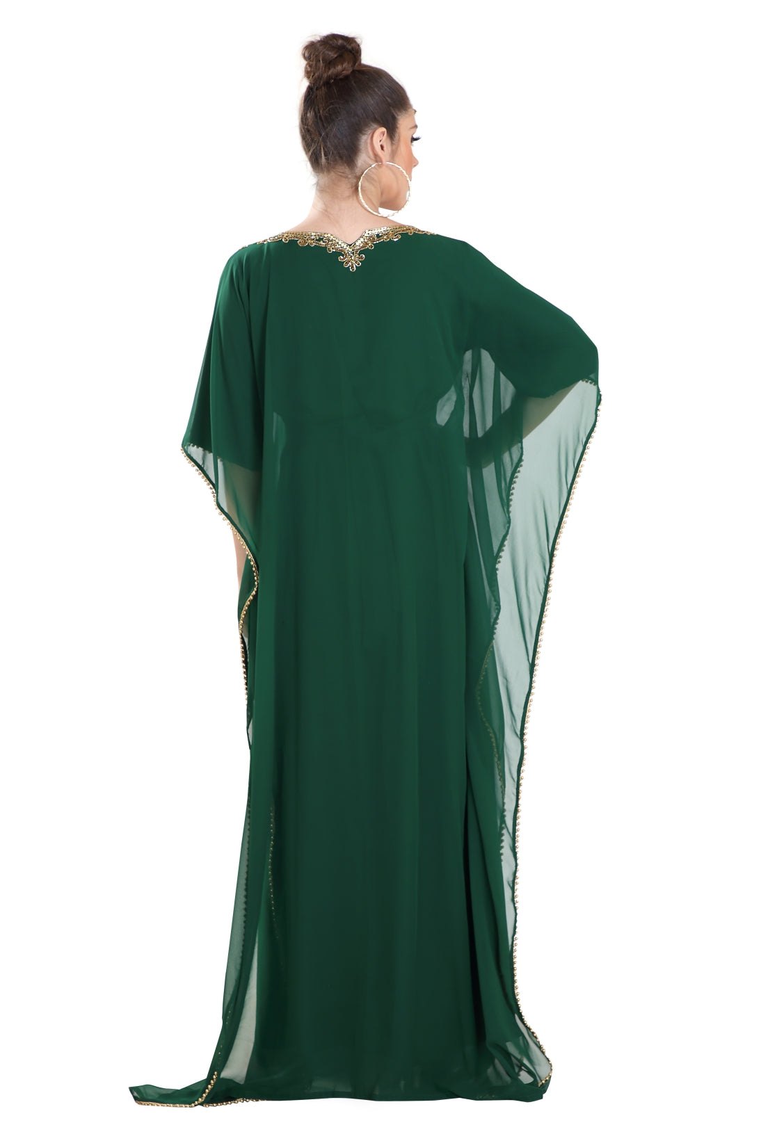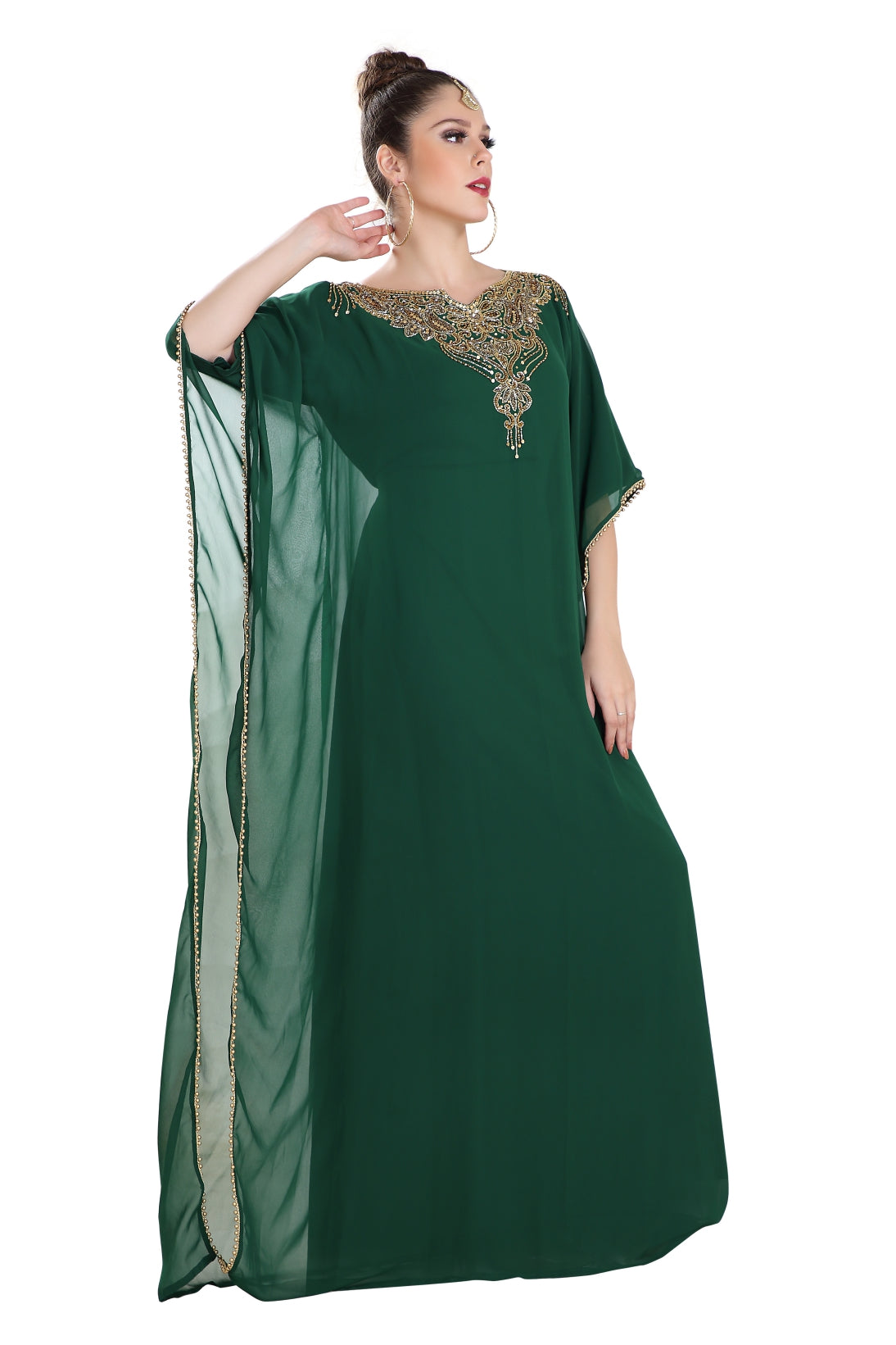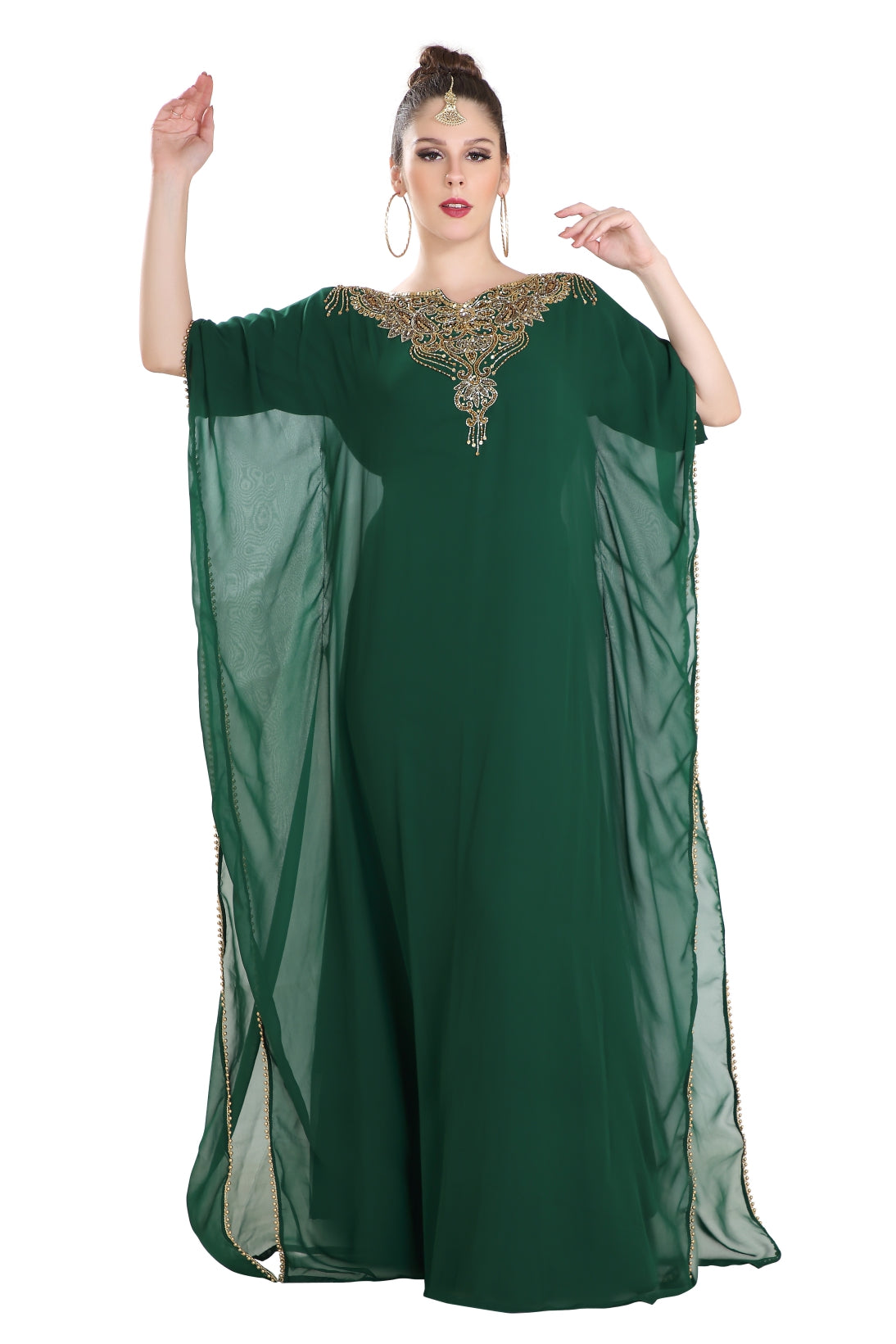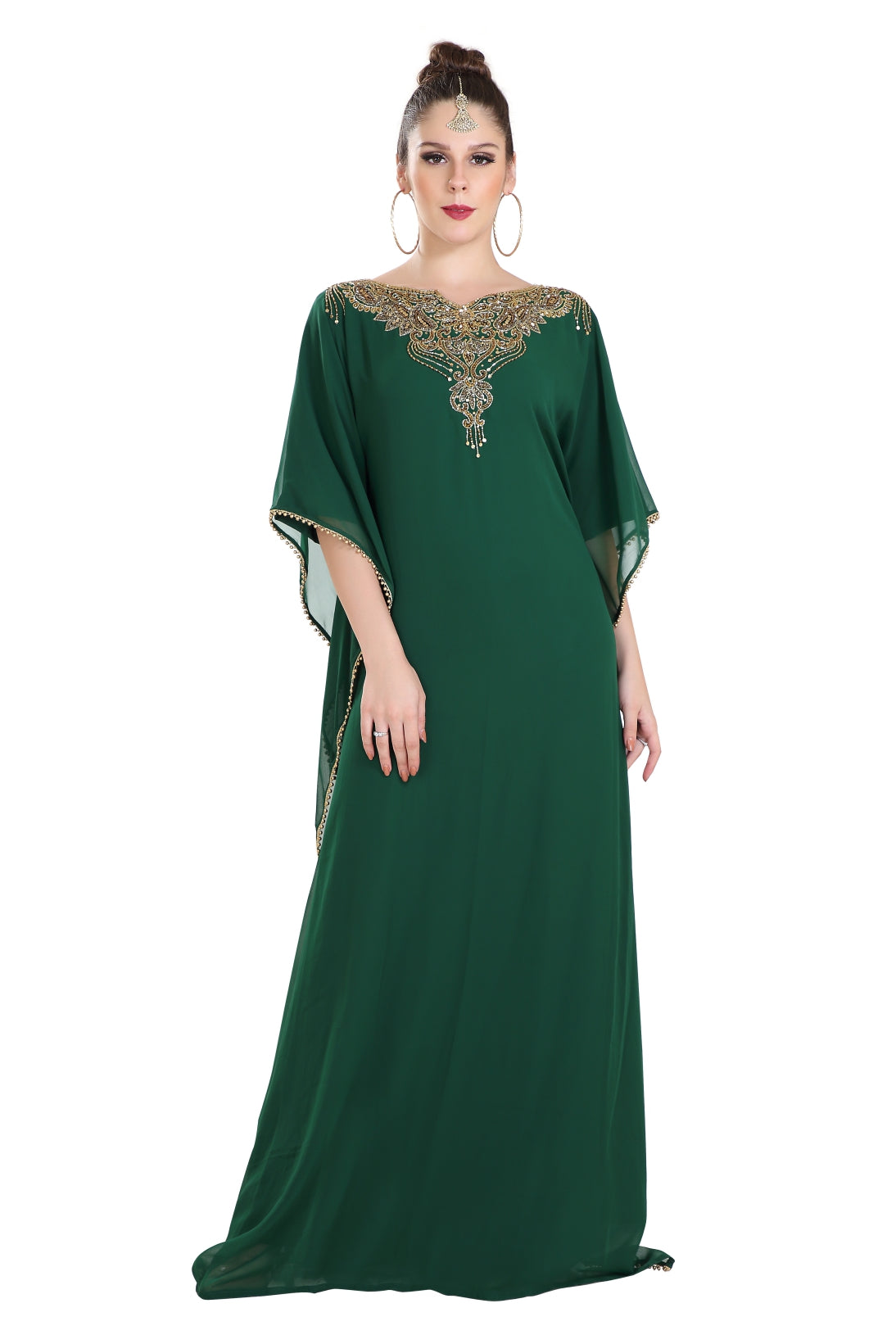 Fresh and sparkling! This long maxi gown will keep you fresh throughout your event. It is designed with a very cool and light weighted georgette fabric and also has a soft inner lining. This kaftan is hand embroidered with mix colour beads. Brought to you by maxim creation, this stunning piece is versatile and easy to wash and wear. This dress is 1 piece set & half sleeve dress. |
