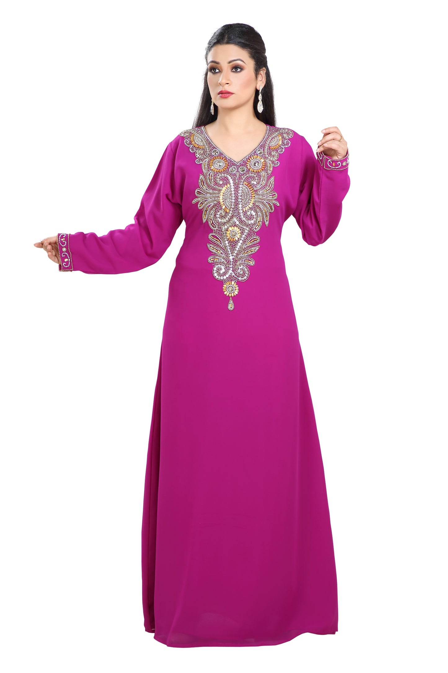 This mix colour beads and sequins hand embroidery will glitter up your occasion. This georgette fabric kaftan dress is 1 piece set & full sleeve dress + 1 free belt (This dress is lined from the inside). |