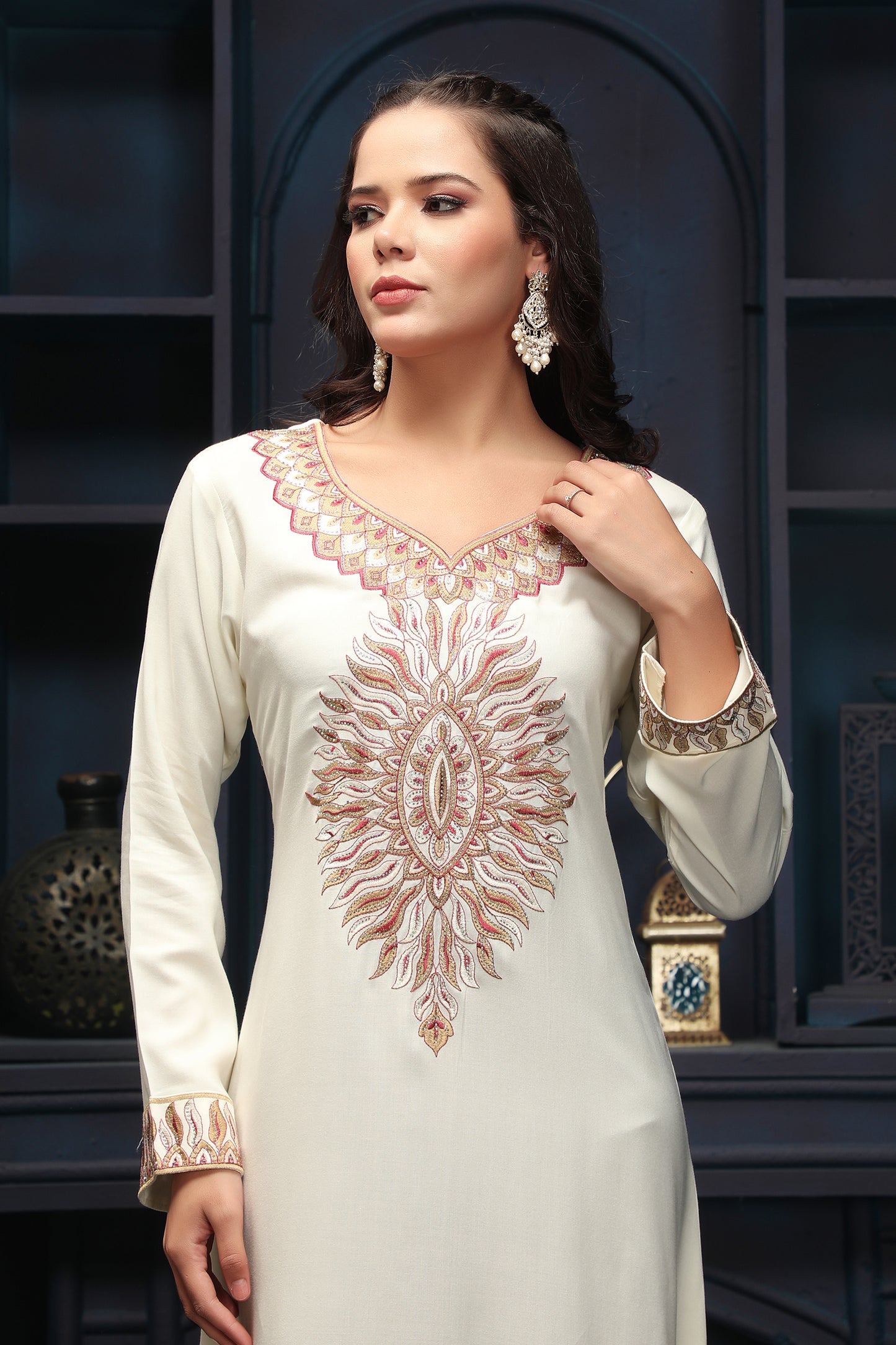 Designer Jalabiya in Ivory with Multicolor Embroidery |