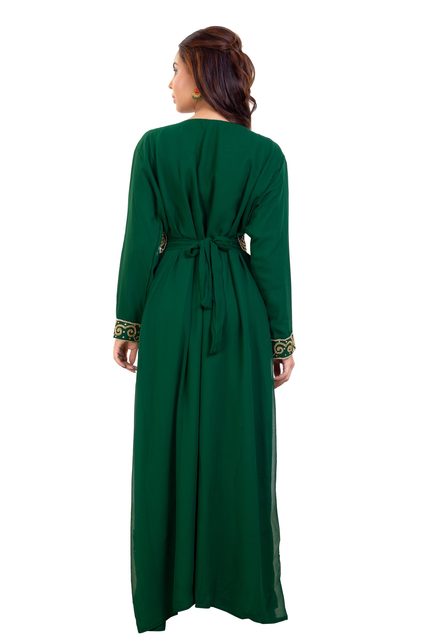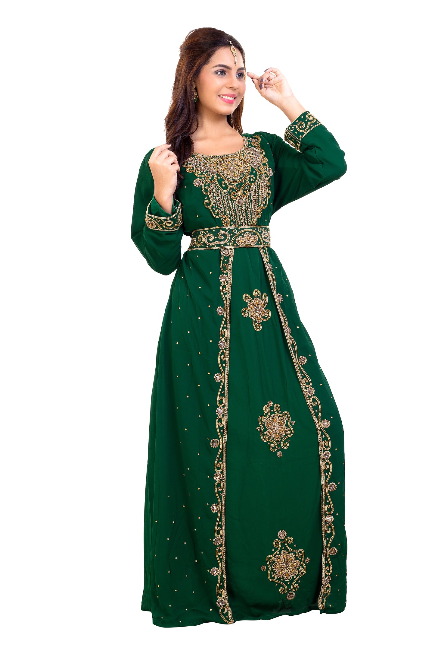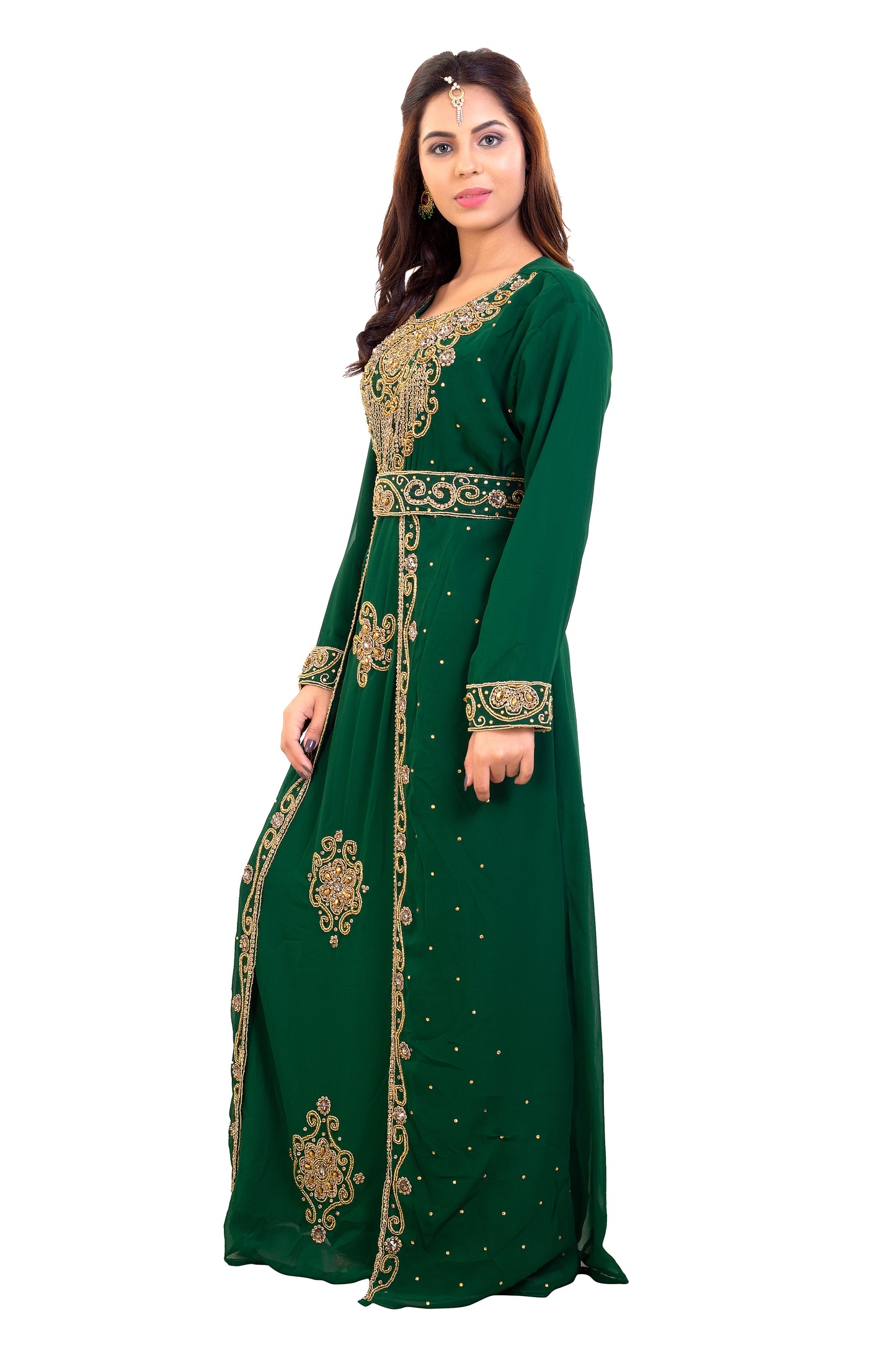 Simplicity is the generator of sophistication. This attire is made-to-purchase. Whether you opt for an ideal size or convention measurements, Maxim Creation designs each outfit to order. This Piece is embellished with Golden beads and sequins. It is fully lined. In this A-line, U-neck dress, you can draw attention to your wedding. In 2-Piece Set, this long sleeve dress comes with a belt absolutely free. However, size ranges from XS to 5XL.